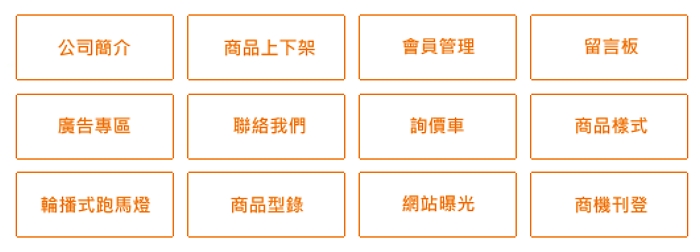 ◆簡易的操作介面,自行編排、立即更新。 ◆依行業別提供多款、不同色系的模版套用機制,方便企業選擇適用的色系風格。 ◆七大廣告專區,在不同頁面宣傳促銷活動、熱門產品…等。 ◆製作電子型錄,呈現商品內容、圖片,供客戶線上瀏覽。 ◆可設定專屬形象頁面,提升客戶對企業的信賴度。 ◆商品批次上、下架功能,節省商品上、下架時間,達到事半功倍的效益。