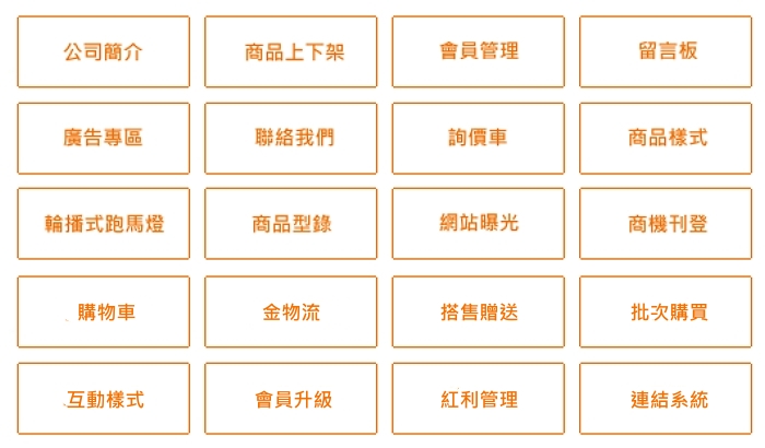 ◆多款模版及色系可供企業選擇套用 ◆七大廣告專區,在不同頁面可搭配商品推廣及促銷活動加強站內曝光 ◆完整購物車系統,整合金/物流機制,線上接單,完成交易 ◆同一商品可設定多種商品樣式類別(例如:規格、型號…等等),供會員選擇 ◆會員於購物網站可批次點選多樣商品,方便會員快速採購 ◆提供多種商品銷售模式,達到連鎖促銷效果