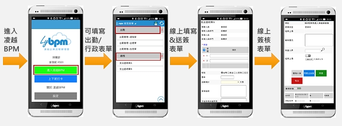 凌越【手機APP】服務,提供線上填寫出勤表單(請假/加班/出差單)&行政表單,依據設定的流程線上即時送簽,主管不管身處何地登入手機APP即可進行簽核,不受時間地點限制 。