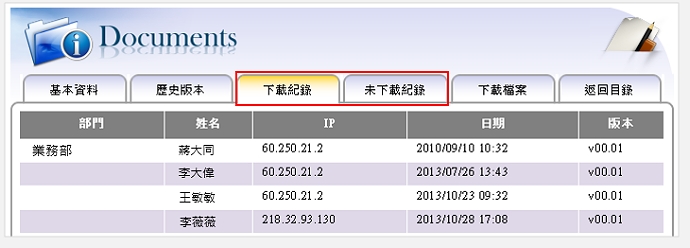 凌越BPM【檔案管理】會記錄每一份文件的下載記錄(部門、人員姓名、日期、版本)/未下載記錄等。